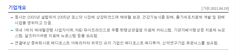 - 동사는 2000년 설립되어 2005년 코스닥 시장에 상장되었으며 제대혈 보관, 건강기능식품 판매, 줄기세포치료제 개발 및 판매 사업을 영위하고 있음.