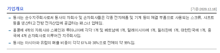 - 동사는 순수지주회사로써 동사의 자회사 및 손자회사들은 각종 전자제품 및 기계 등의 체결 부품으로 사용되는 스크류, 샤프트 등을 생산하고 전방 전자산업에 공급하는 패스너 업체임.